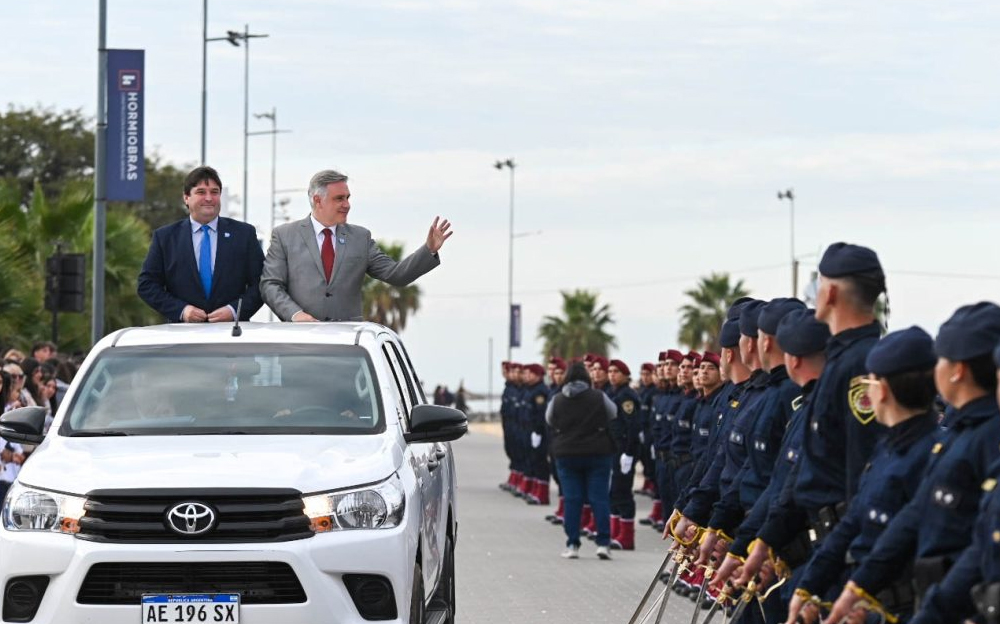 En Miramar, departamento San Justo, el gobernador Martín Llaryora tomó juramento a la bandera argentina a 273 aspirantes de segundo año pertenecientes a la promoción 223 de la escuela de suboficiales de la Policía de Córdoba, General Manuel Belgrano.