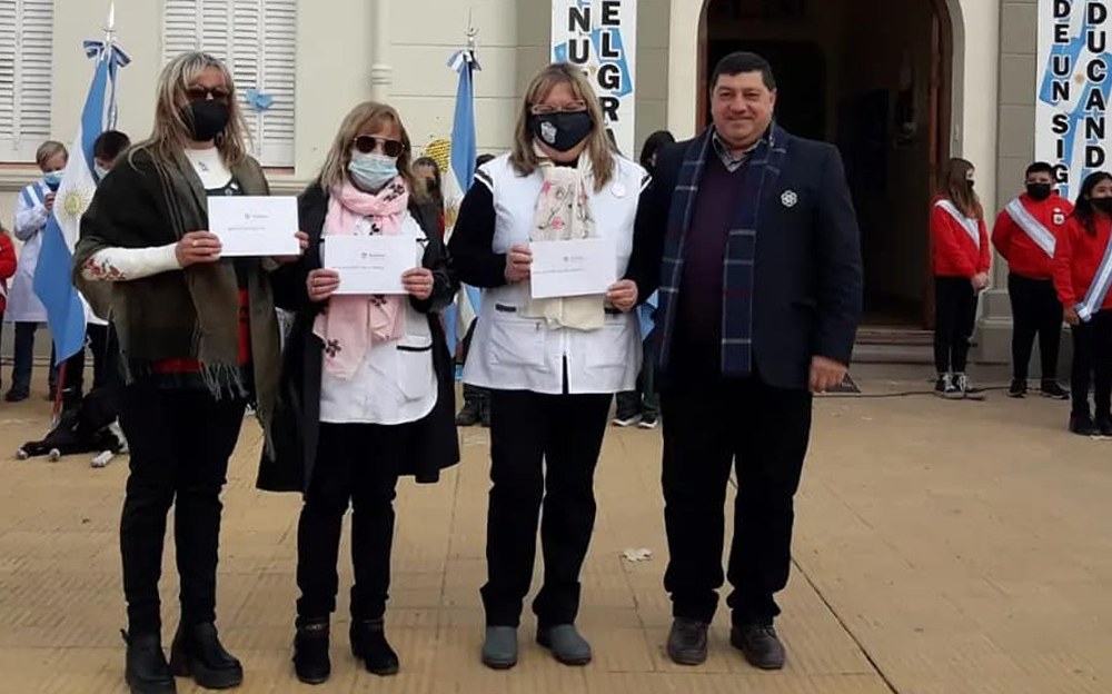 En el Acto por el Día de la Bandera, el intendente Edwin Riva hizo entrega a las directoras de las escuelas de Nivel Primario del conforme al Art. 3 de la Ordenanza 21/14 de la cobertura de la cuota mensual por el año en curso a los y las estudiantes que recibieron la Distinción “Manuel Belgrano”.