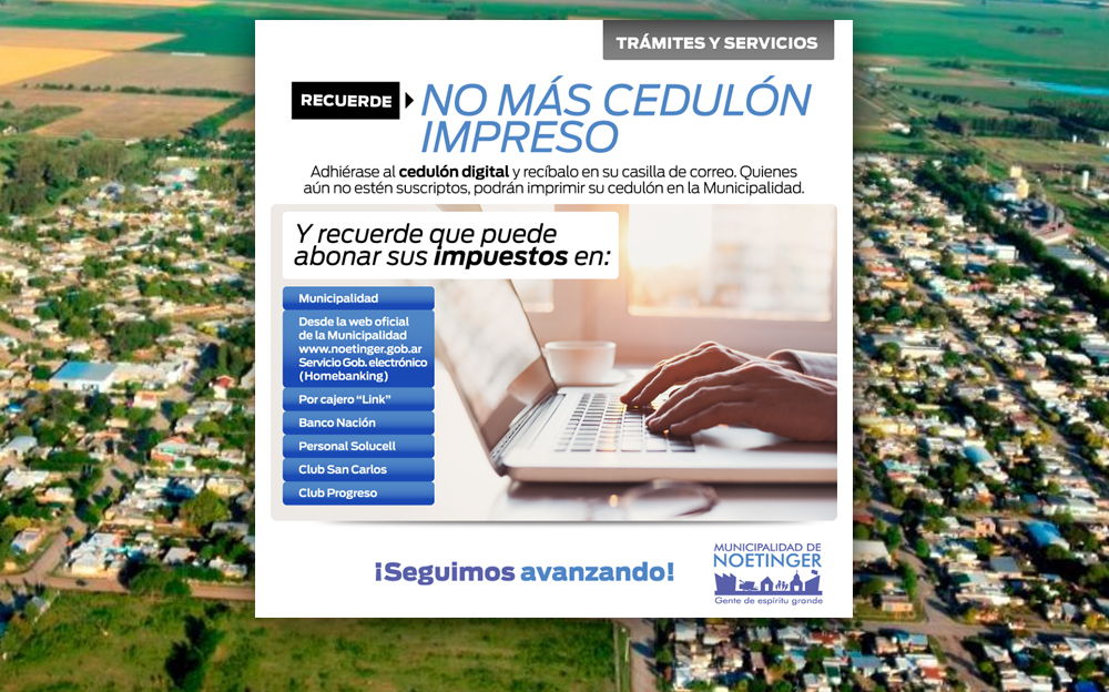 La municipalidad de Noetinger recuerda que el cedulón municipal ha dejado de imprimirse y enviarse a domicilio por lo que se solicita realizar el alta a través del portal de la municipalidad y así, comenzar a recibir el nuevo cedulón digital en su casilla de correo.