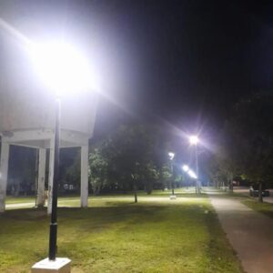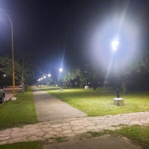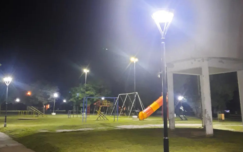 La plaza “9 de julio” luce renovada con las nuevas columnas con luminarias led colocadas por el Municipio en todo el perímetro de la caminería y en la zona de juegos.