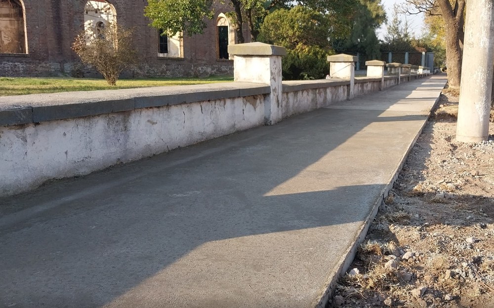 La Municipalidad de Corral de Bustos Ifflinger construye la nueva vereda parquizada paralela a calle Alberdi.