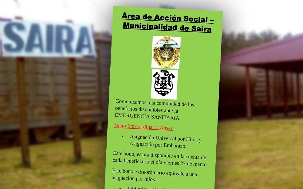 Saira: Comunicado del área de acción social noticias 27 marzo, 2020Triple Media La municipalidad de Saira a través del área de Acción Social difundió los beneficios disponibles en la localidad.