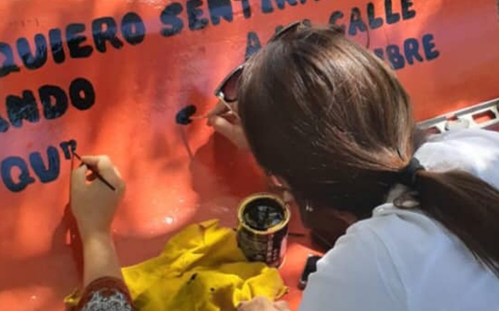 La frase que quedó plasmada sobre un banco con fondo naranja tal como es el color que caracteriza, este año, a la campaña de concientización de lucha contra las violencias en mujeres y niñas.
