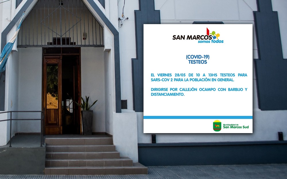 San Marcos Sud: Testeos COVID19 noticias 26 mayo, 2021Triple Media La Municipalidad de San Marcos Sud comunica a la comunidad la realización de Testeos el próximo Viernes 28 de mayo, de 10 a 13hs. Dirigirse por callejón Ocampo. Llevar barbijo y mantener distancia.