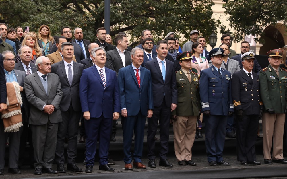 En primer término, se efectuó el izamiento de la Bandera Argentina en el mástil de la plaza San Martín, acto durante el cual los presentes entonaron las estrofas del Himno Nacional Argentino.