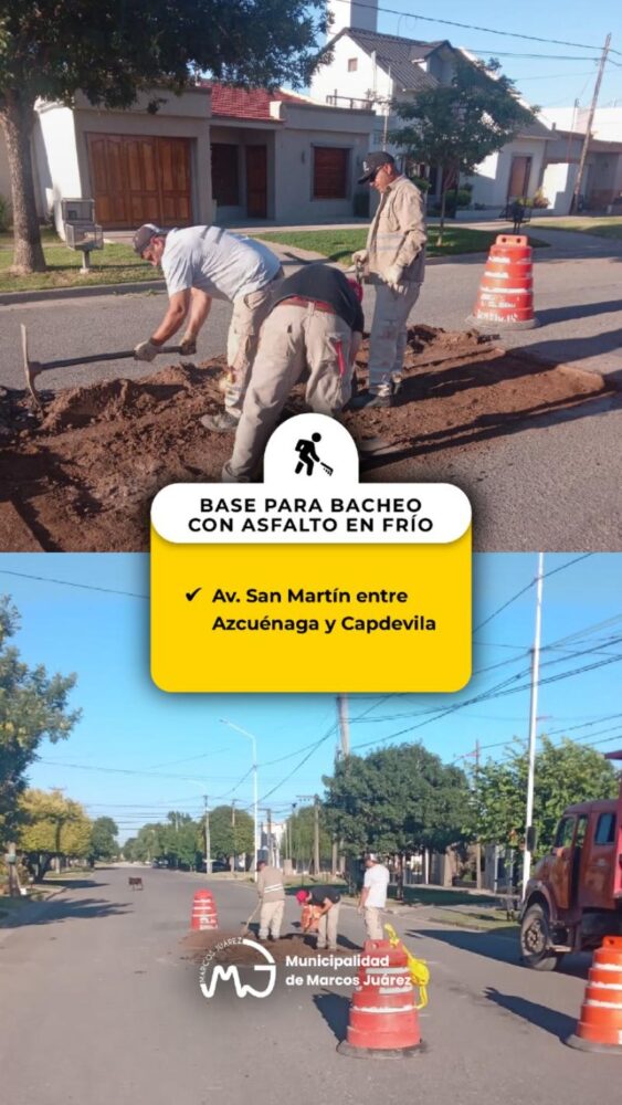 Los equipos de trabajo del área de Servicios Urbanísticos de la Municipalidad de Marcos Juárez están preparando el bache de San Martín entre Azcuénaga y Capdevilla para colocar asfalto en frío.