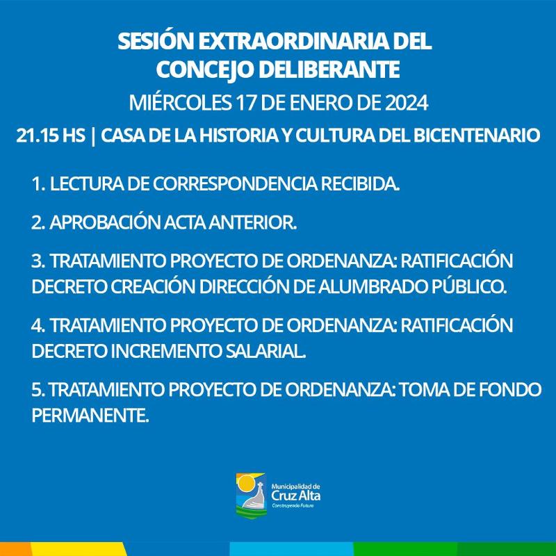 El próximo miércoles 17 de enero a las 21.15 hs en la Casa de la Historia y Cultura del Bicentenario, se realizará la primera sesión extraordinaria 2024 del Concejo Deliberante de Cruz Alta.
