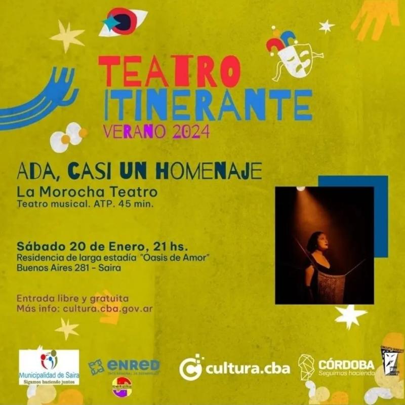 Teatro Itinerante en Saira noticias 17 enero, 2024Triple Media “ADA, CASI UN HOMENAJE” ( teatro musical) del grupo La Morocha llega a Saira el Sábado 20 de enero. La Residencia Larga Estadía será el espacio en donde compartir esta experiencia teatral (Buenos Aires 281). 21:00 hs ENTRADA LIBRE Y GRATUITA