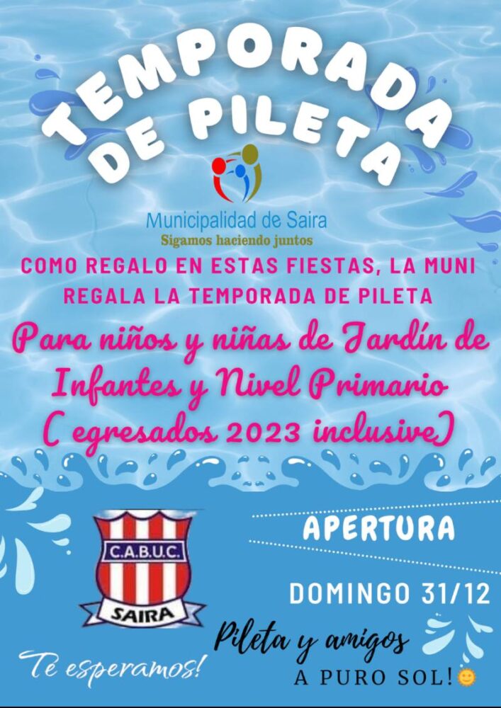 Temporada de Pileta en Saira noticias 30 diciembre, 2023Triple Media Como regalo para estas fiestas, la Municipalidad de Saira regala la temporada de pileta. Los beneficiarios son: NIÑOS Y NIÑAS DE JARDÍN DE INFANTES NIVEL PRIMARIO ( EGRESADOS 2023 INCLUSIVE) APERTURA: Domingo 31/12 Club Unión Central de Saira