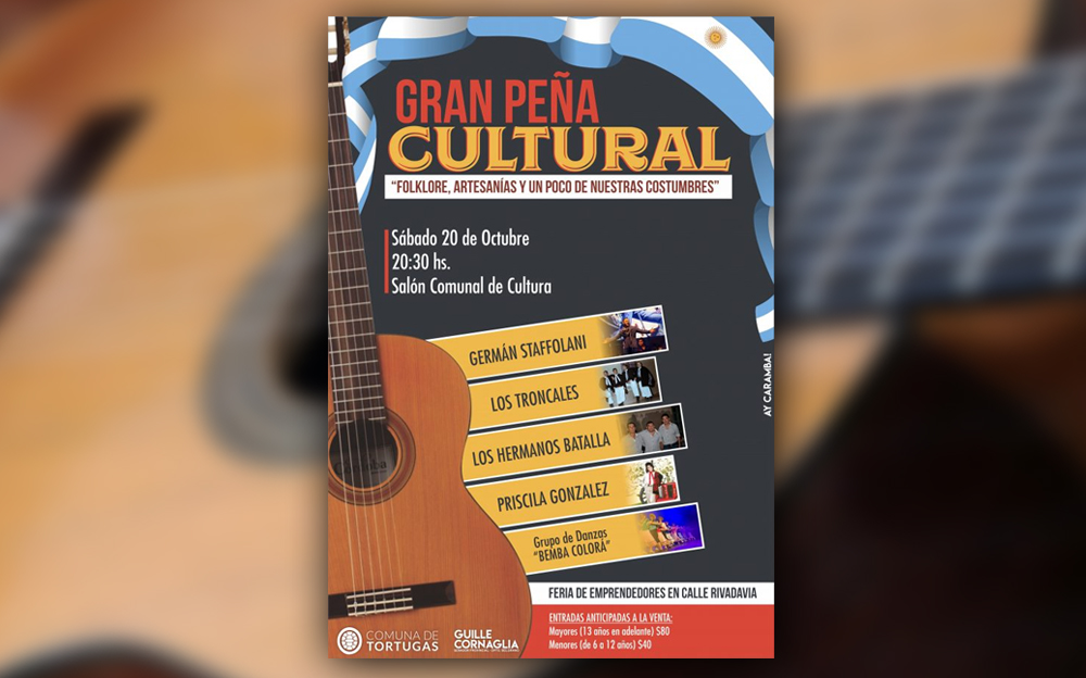 El próximo sábado 20 de octubre se realizará la Gran Peña Cultural en el Salón Comunal de Cultura a partir de las 20:30hs. La Secretaría de Cultura y Educación invita a participar de una noche que contará con diferentes matices, que no sólo incluye el segmento musical de grandes artistas locales y de toda la región.